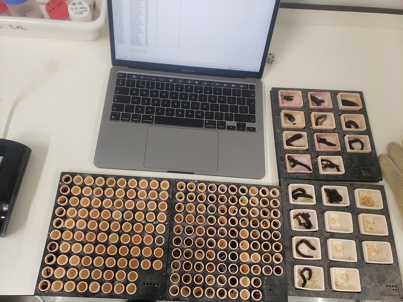 Prey items in crucibles, prior to incineration. Photograph from Hailley Danielson